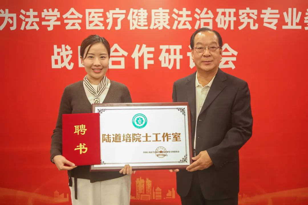 △中组部原副部级巡视专员、中国行为法学会医疗健康法治研究专业委员会顾问马瑞民为“陆道培院士工作室”代表北京陆道培血液病研究院发展部主任杨亚琼授牌并颁发聘书