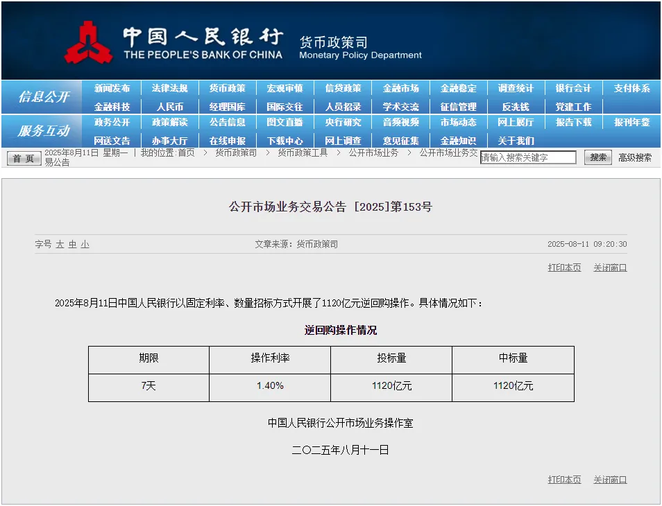 2025年8月11日中国人民银行以固定利率、数量招标方式开展了1120亿元逆回购操作。