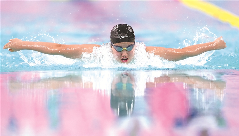 11月17日,第十五届全国运动会游泳女子400米个人混合泳决赛在广东省深圳市举行,河北队选手于子迪在决赛中获得冠军。新华社记者 薛宇舸 摄