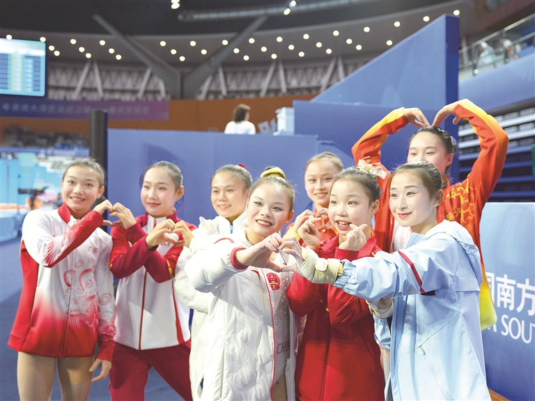 11月17日,第十五届全国运动会体操项目女子自由体操决赛在广东省肇庆市举行,参赛选手在比赛后合影。新华社记者 胥冰洁 摄