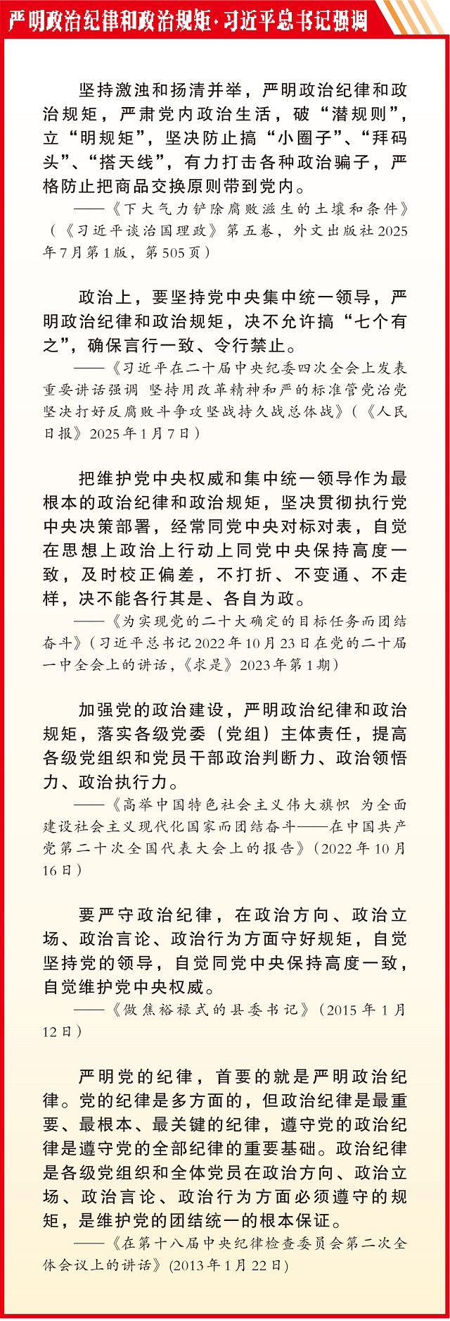 政治问题,从来都是带有根本性的大问题。在党的各项纪律中,政治纪律是最重要、最根本、最关键的纪律。党的十八大以来,习近平总书记多次就政治纪律和政治规矩作出重要论述,明确把政治纪律、政治规矩摆在管党治党的突出位置,明确要求全面从严治党必须首先注重政治上的要求,必须严明政治纪律和政治规矩。