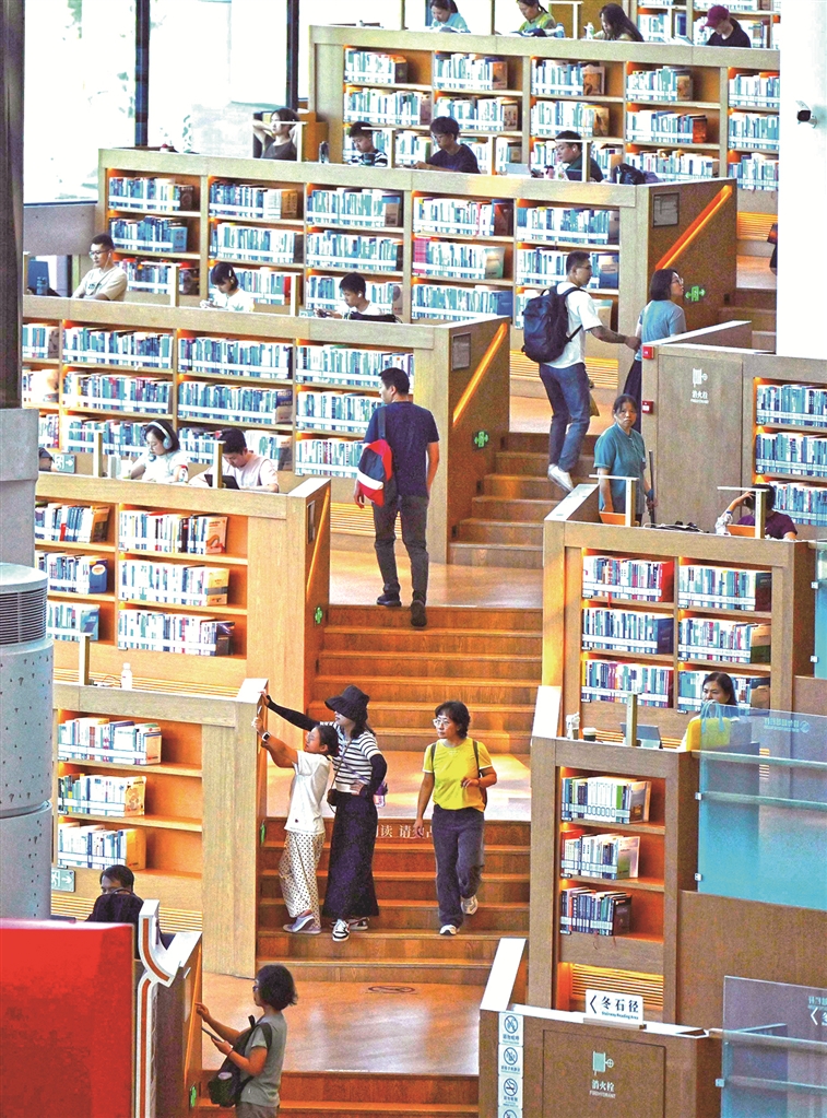 北京城市图书馆,不少读者手捧书籍,或静坐于阅览区专注研读,或在书架间缓步穿梭挑选读物。