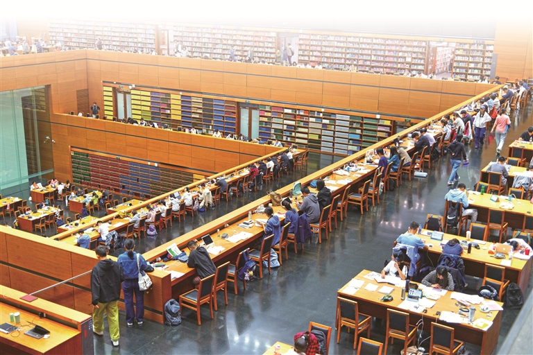 国家图书馆多层阅览大厅座无虚席,大家在书香浓厚的氛围中认真看书学习。 图片来源:视觉中国