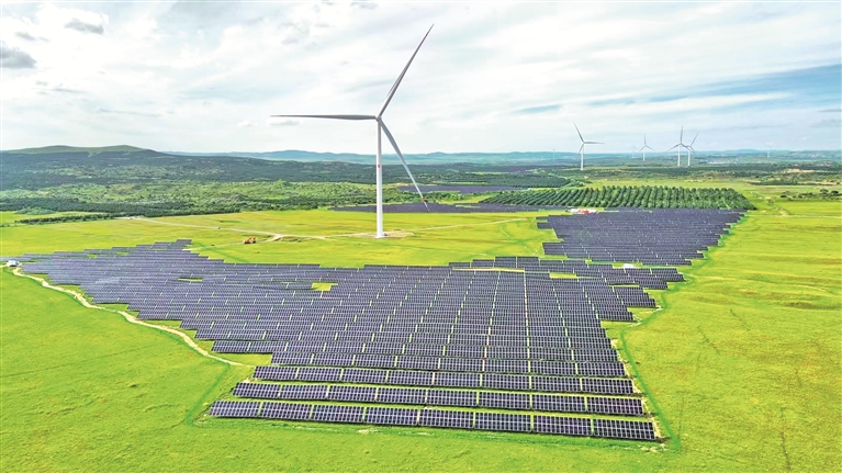 中国大唐多伦15万千瓦风光储制氢一体化示范项目的风力发电机组和光伏板。受访单位供图