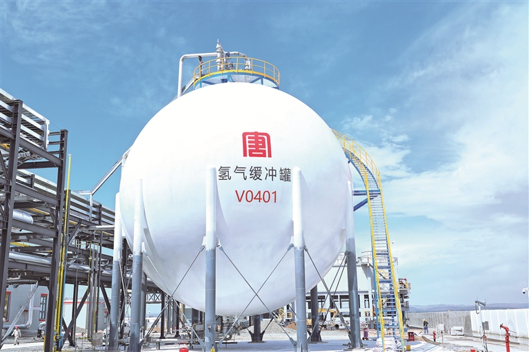 中国大唐多伦15万千瓦风光储制氢一体化示范项目制氢电站内的氢气缓冲罐。受访单位供图
