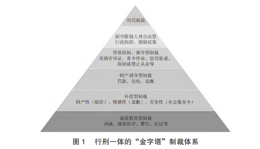 四、行刑一体制裁论视野下双向衔接机制构建 跳出传统行刑二元模式,采用行刑一体制裁论,在立法上统筹考虑刑法与行政法的密切关联,以及行政法内部协调关系,形成由轻到重、多元化的“金字塔”制裁体系;执法司法上建构与“金字塔”制裁体系对应的阶层式“需罚性”审查机制、行刑协同执法机制,并重构“一事不二罚”规则。 (一)构建行刑一体“金字塔”制裁体系 目前,我国《刑法》第37条规定了6类非刑罚处罚措施:训诫、责令具结悔过、赔礼道歉、赔偿损失、行政处罚、行政处分;第64条还规定了没收违法所得、追缴、责令退赔。《刑法》第64条的没收违法所得与第59条的没收财产性质不同,前者属于非刑罚处罚措施,后者是一种刑罚种类。在德国,追缴和没收也是作为独立的制裁措施,立法者将其中性地表述为“措施”(Massnahmen),以此来表明其既不是刑罚,也不是保安处分,而是独立的非刑罚制裁。我国《行政处罚法》规定的行政处罚种类包括:(1)警告、通报批评;(2)罚款、没收违法所得、没收非法财物;(3)暂扣许可证件、降低资质等级、吊销许可证件;(4)限制开展生产经营活动、责令停产停业、责令关闭、限制从业;(5)行政拘留。《治安管理处罚法》第10条规定的行政处罚有5种:警告、罚款、行政拘留、吊销许可证、外国人限期出境或驱逐出境,第11条规定了收缴。另外,其他各领域的行政法规还设置了各种称谓不一的行政制裁措施。 上述杂乱无章的制裁措施,与行刑二元模式密切关联,典型特点是缺乏体系性和衔接性。在行刑二元模式支配下,刑法和行政法制裁的种类、严厉程度、内容甚至名称都是各自为政,缺乏轻重有序衔接。例如,刑法规定的罚金数额与行政法规定的罚款数额严重失衡。又如《公司法》第250条至第256条规定的“责令改正”这一项制裁措施是《行政处罚法》所没有的;《食品安全法》第122条第2款规定的“责令停止违法行为”也是《行政处罚法》所没有的。广受关注且“杀伤力”对于企业而言堪比“死刑”的“黑名单”信用惩戒措施,竟然出自国家税务总局的红头文件《重大税收违法失信主体信息公布管理办法》。《强制戒毒办法》竟然还有长期限制人身自由的“强制戒毒”。刑法中的非刑罚制裁措施也很不完善,特别是缺乏社会服务令。 根据行刑一体制裁论,应当对上述各种制裁进行系统化清理和整合,立法者应当一体化考量《刑法》《行政处罚法》以及其他各领域行政法规中制裁措施的有序衔接,按照比例原则,在国家制裁体系中形成由轻到重的“金字塔”制裁体系,由低到高依次可以分为六类制裁措施:(1)说服教育型,将刑法中的训诫以及行政法规中的通报批评、警告以及《公职人员政务处分法》中的记过等一体化整合为最低严厉程度的制裁。(2)补偿型,包括财产性补偿、情感性补偿和劳务性补偿三种。财产性补偿即赔偿,正如边沁所言:“可补偿的犯罪相比之下是轻微的。可能用金钱补偿的每一件事情都可能很快变成似乎从未发生一样;因为被害人如果总是得到一种同等的补偿,那么该犯罪所造成的惊恐也会一同消失,或降低到最低程度。”罗克辛甚至认为赔偿可以作为刑罚和保安处分之间的“第三条道路”,他认为,对于那些使用小额罚金进行处理的案件,完全可以通过赔偿来免除刑罚,赔偿已经不再是一个纯粹的民法问题,它本质上具有重新社会化的功能,它强制着行为人对自己的行为后果进行深入分析后与被害人达成和解,并能够增进行为人对法规范效力的认知,从而使本来应当受到刑事处罚的人重新回归社会,因此,赔偿对于一体化预防,重建法和平意义重大。情感性补偿主要适用于伤害被害人心理、情感的案件。劳务性补偿主要是指社会服务令,即要求犯罪人在一定时间内为社会提供某种形式的无偿劳动以实现改造罪犯、预防犯罪。在国际上,社会服务令在替代短期自由刑方面发挥着重要作用,通过非监禁的劳动改造,不仅能达到短期自由刑同等的预防效果,更能防止监禁场所的交叉感染。我国司法实践中已经在探索社会服务令,亟待立法确认。(3)财产剥夺型,主要包括罚款、没收、追缴。(4)资格限制、剥夺型,主要包括暂扣许可证件、降低资质等级、吊销许可证件、责令停产停业、限制或禁止从业、信用惩戒,以及政务处分中的降级或撤职等。(5)限制、剥夺人身自由型,此类措施应严格限制为行政拘留。强制戒毒的本来功能是成瘾治疗,但实践中已经异化剥夺人身自由,且期限过长,应当参照劳动教养予以改革。(6)刑罚,包括罚金、管制、拘役、有期徒刑等,作为最后、最严厉的制裁手段。 上述制裁体系应当按照比例原则进行阶梯式设计,形成“金字塔”制裁体系。比例原则是公法的帝王原则,包括必要性原则和相称性原则,必要性原则又称最少侵害原则或最温和方式原则,即面对多种合适达成国家治理目的的手段可供选择时,应选择对当事人利益限制或损害最小的手段。必要性原则的前提是存在若干适合的可供选择的制裁手段。因此,要在立法上建立轻重有序、多元化的可供选择的行刑一体制裁体系。制裁的严厉程度应当与违法程度成正比,即违法程度越高,制裁越严厉;与制裁使用的频次成反比,即严厉程度越低,越应当优先适用。如图1所示。 (二)建立阶层式“需罚性”审查机制 根据行刑一体制裁论,多元