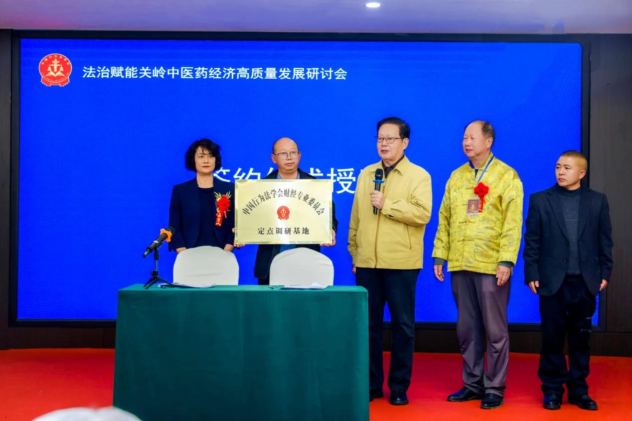 研讨会期间举行了签约仪式与授牌仪式。中国行为法学会财经专委会与关岭自治县民族医生协会、关岭自治县苗医苗药协会正式签署《“中医药法治实践基地”共建及“中医药产业合规研究”课题合作协议》,标志着双方在中医药法治建设与学术研究领域的深度合作正式启动。同时,中国行为法学会财经专业委员会秘书长钱瑛代表主办方,向关岭自治县于锦江民族医馆授予“定点调研基地企业”牌匾,为中医药产业实践研究与成果转化搭建了坚实平台。