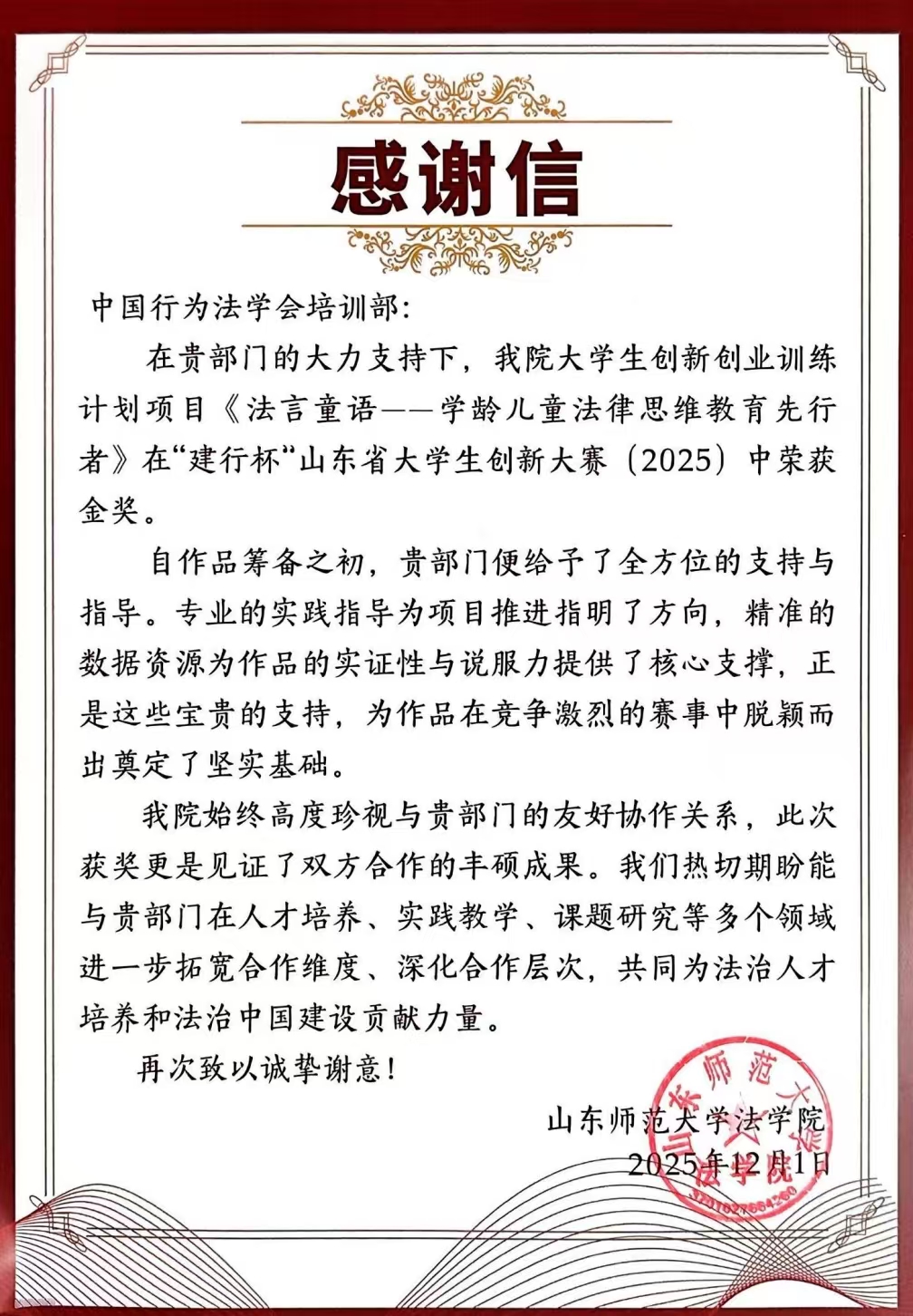 山东师范大学法学院向中国行为法学会培训部致感谢信