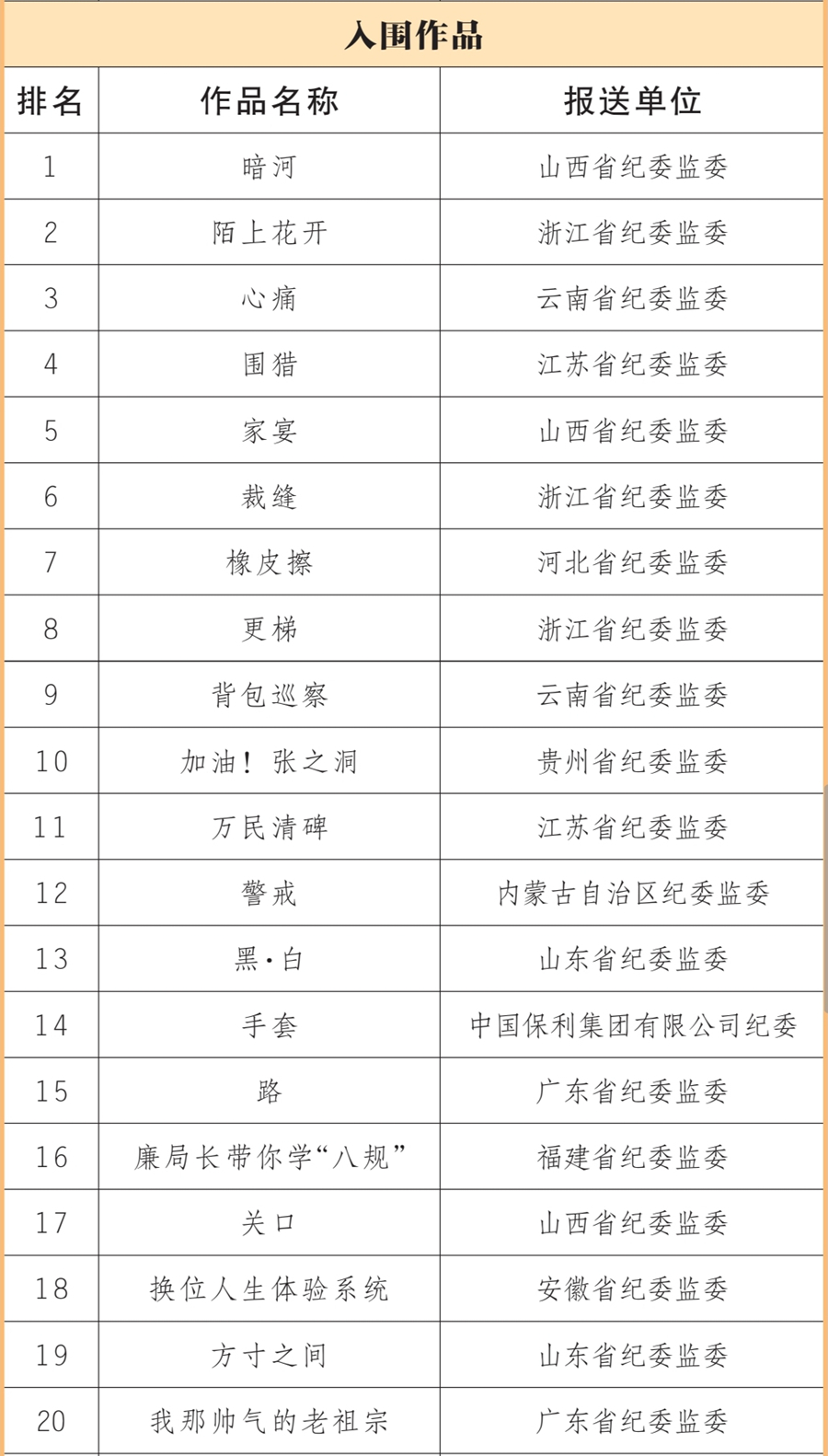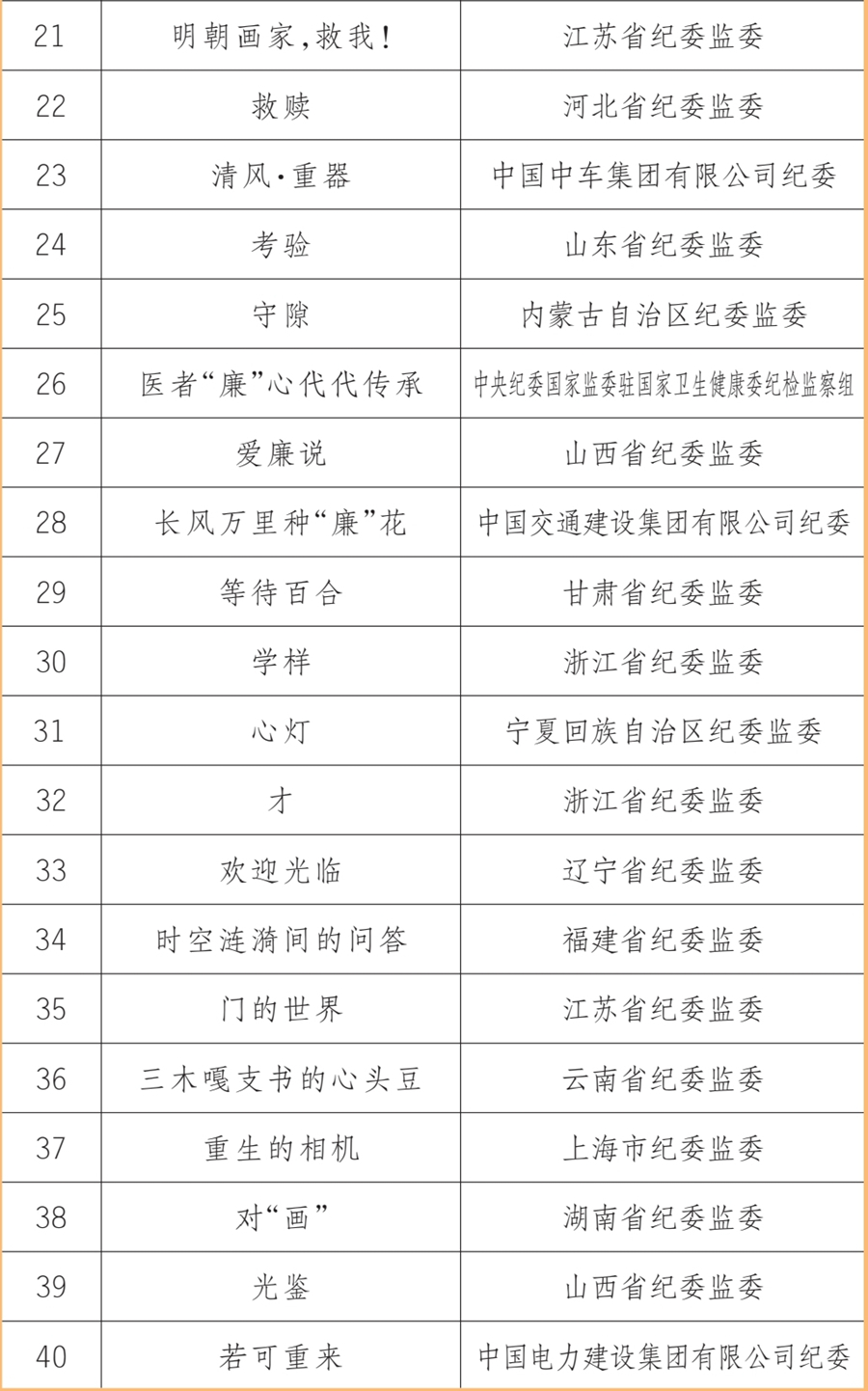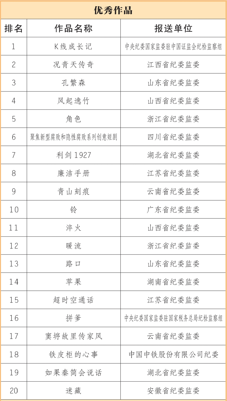 中央纪委国家监委网站讯 近日,由中央纪委国家监委宣传部、中央宣传部文艺局、中央网信办网络传播局联合主办,人民网承办的新时代廉洁文化微短剧征集展播活动,公布了20部优秀作品、40部入围作品(名单附后)。浙江省纪委监委、山西省纪委监委、中央纪委国家监委驻中国证监会纪检监察组等10家单位获评优秀组织单位。