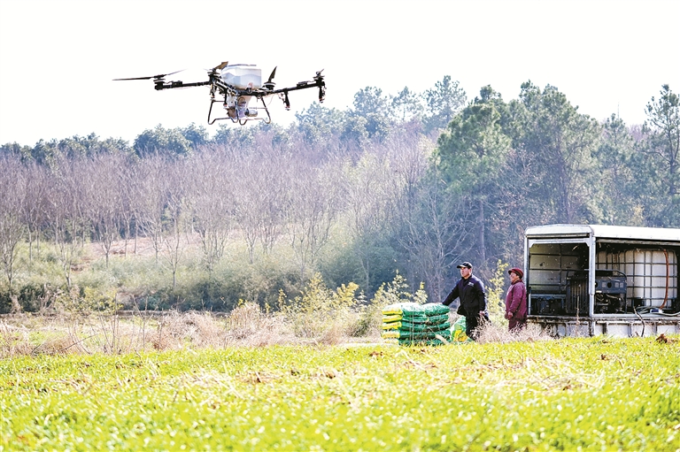 立春来临,小麦生长进入田间肥培管理关键期,农民抢抓农时进行肥培综合管理,为小麦丰产丰收奠定基础。图为2月3日,在浙江省安吉县,无人机正在喷洒肥料。 图片来源:视觉中国