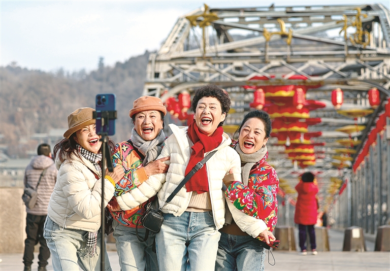 新春佳节临近,有着上百年历史的甘肃兰州黄河铁桥——中山桥上挂起大红灯笼,营造出红红火火的迎新氛围。图为游客在兰州市城关区中山桥前拍照。 新华社发(侯崇慧 摄)
