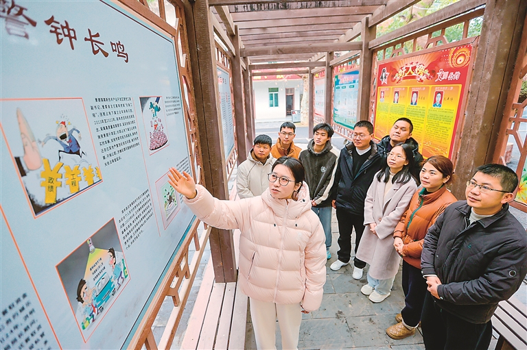 江西省吉安市峡江县将廉洁文化建设融入警示教育、纪律教育工作中,通过现场教学与“纪律小课堂”相结合的方式,引导党员干部坚定理想信念、树牢宗旨意识,推动廉洁文化浸润人心。图为该县罗田镇党员干部在镇廉洁文化长廊观看展板。 图片来源:视觉中国