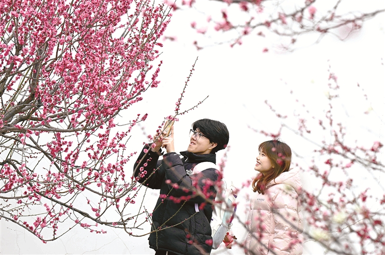 图为3月14日,游客在河北省石家庄市植物园梅园赏花拍照。 新华社发(陈其保 摄)