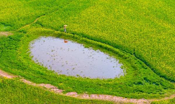 三月的风,吹醒了人间的万般春色。在浙江省浦江县前吴乡通济湖库尾,油菜花田成了金色海洋。游人循着春色而来,漫步在花田小径间,静静与春光相拥。(浙江省浦江县纪委监委供 赵新尧 摄)