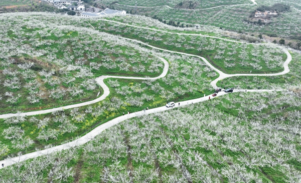 春风漫过山峦,贵州省锦屏县敦寨镇龙池万亩果场漫山李花竞相绽放,如霜似雪铺满丘陵。蜿蜒的小道如银带穿梭花海,游人漫步其间,车辆缓缓穿行,在素白繁花里邂逅春日生机。(贵州省锦屏县纪委监委供 杨晓海 摄)