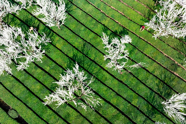 春日茶园里,采茶人隐于翠浪间,几树李花在浓绿间晕开片片莹白。风过处,青绿与素白相映,茶香混着花息漫溢。(湖北省五峰土家族自治县纪委监委供 陈亮 摄)