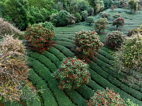 云南省南涧县无量山樱花谷,层层叠叠的茶垄顺着山势铺展,几株马缨花在翠色茶海中热烈盛放,恰似春日里跳动的火焰,与葱茏绿意交相辉映,尽显自然之美与生命之力。(云南省南涧县纪委监委供 罗迎文 摄)