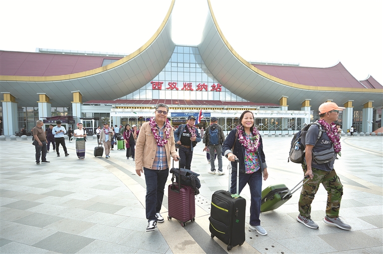图为来自老挝、泰国的游客走出中老铁路西双版纳站。 资料图片